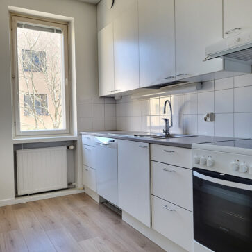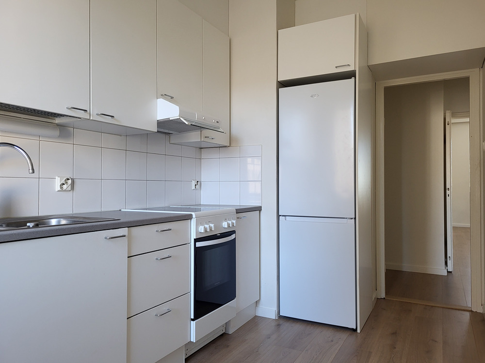 • Keittiön kuvaus Keittiössä valkoinen kaapisto, astianpesukone, keraaminen liesi, liesituuletin sekä jääkaappi-pakastin.
