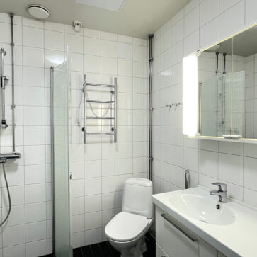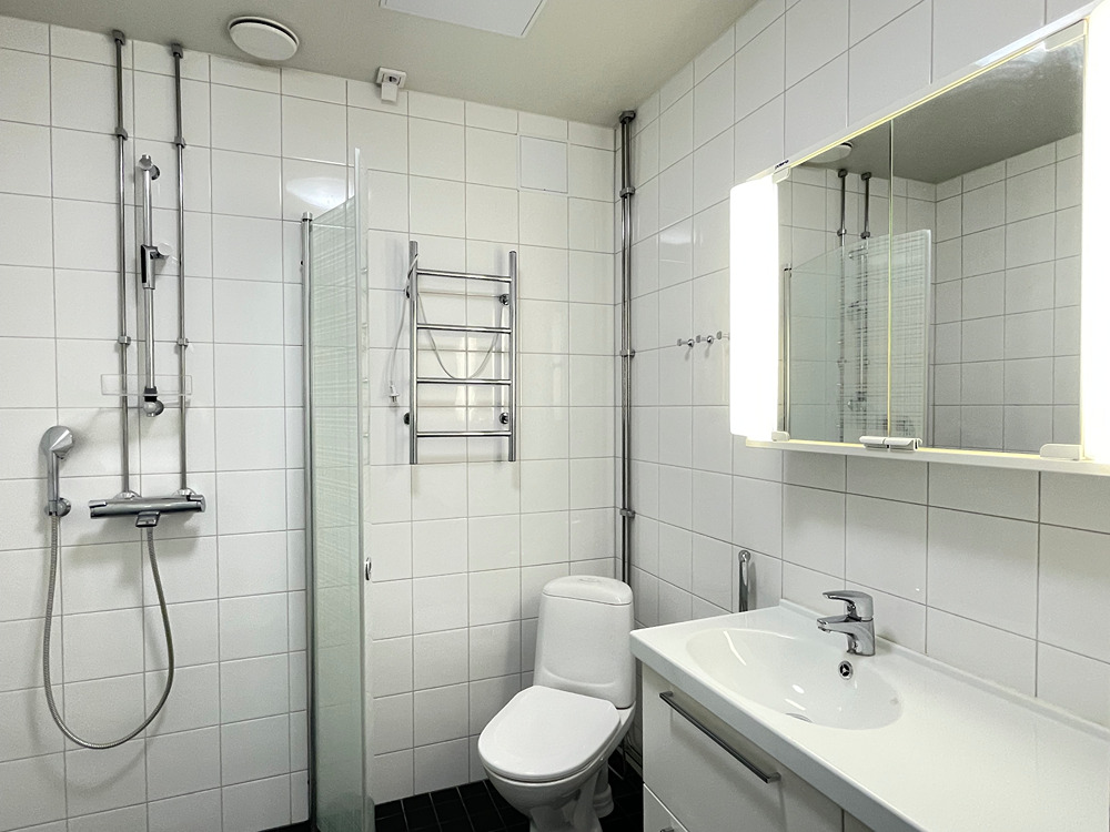 • Kylpyhuoneen kuvaus Kylpyhuoneessa suihku, pesuallas, allas- ja peilikaapit, pyyhekuivain, pesukoneliitäntä ja lattialämmitys.