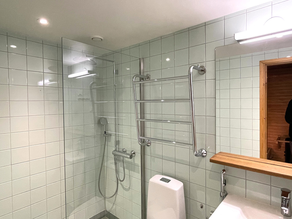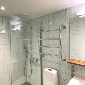• Kylpyhuoneen kuvaus Kylpyhuone 1: Allastaso ja -kaappi, kylpyamme, wc ja pyyhekuivain.Kylpyhuone 2: Allastaso- ja kaappi, suihku, wc, pyyhekuivain ja sauna.2 x erillinen wc