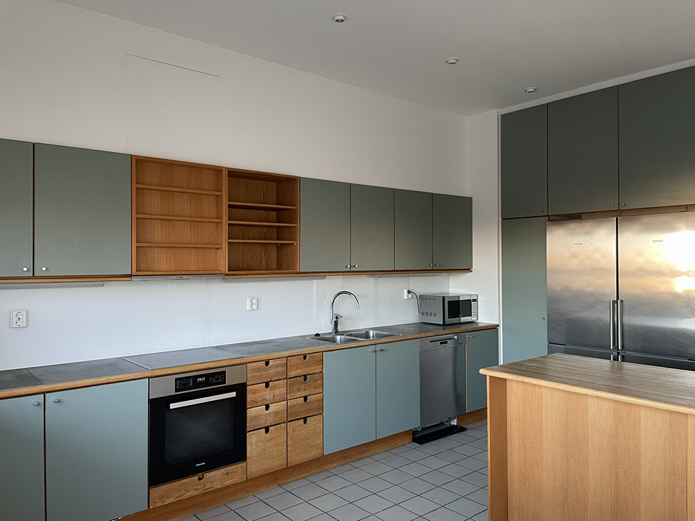 • Keittiön kuvaus Keittiössä induktioliesitaso, erillisuuni, liesituuletin, astianpesukone, 2 x jää-pakastinkaappi sekä mikro.